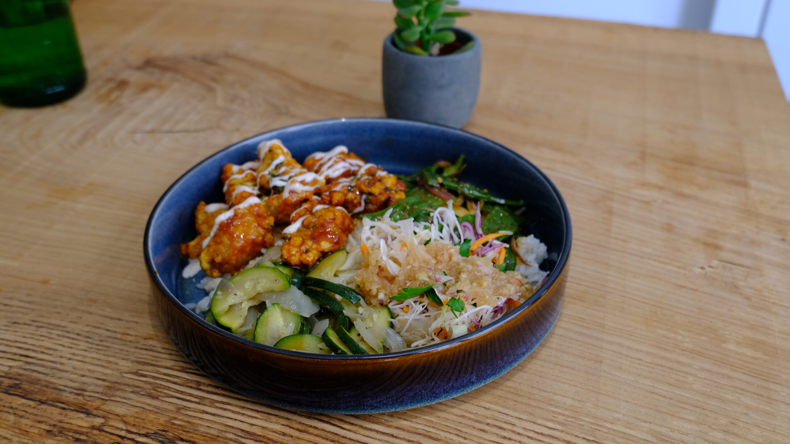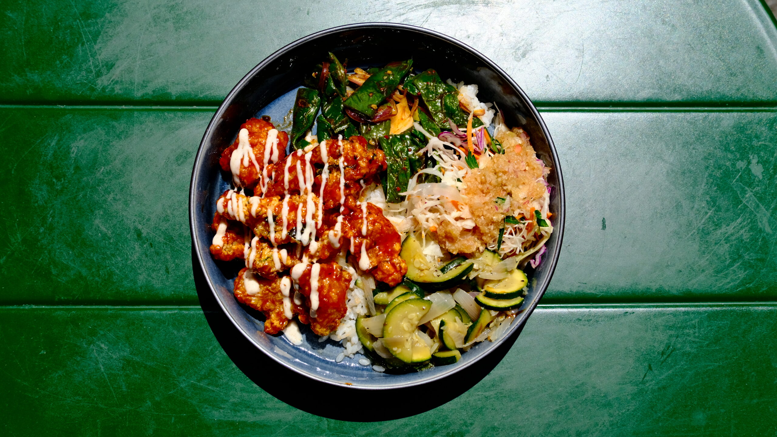 Le Dakgangjeong est un poulet frit coréen croustillant, enrobé d’une sauce sucrée-épicée à base de gochujang, miel et sauce soja, accompagné de riz et de légumes.